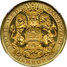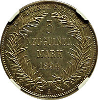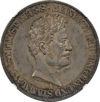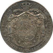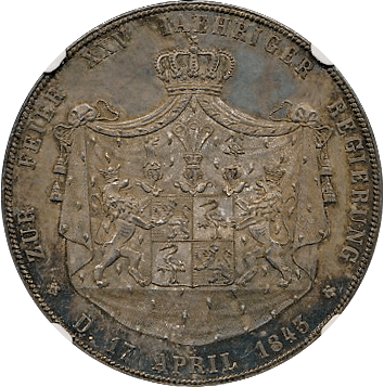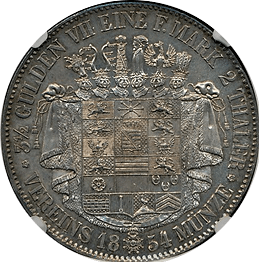 このコインも上のコインと同じく“南部ドイツ通貨同盟”規格の2ターレルです。肖像はブラウンシュバイクの当主だったヴィルヘルム(在位1831-1884)です。この年号の鋳造枚数は約68,000枚ですが、1842年~1850年枚まですべての年号を合わせると27万枚以上になります、例えばさきほどのザクセン・マイニンゲンの2ターレルは1853年と1854年のみの発行(各年14,000枚ずつ)で発行枚数は28,000枚に過ぎません。本銘柄の27万枚は決して2ターレルの中で多いほうではありませんが、逆に希少というほどでもありません。ただ状態はMS64と飛び切りよく、またほかの2ターレル同様に紋章面も素晴らしく、その点を評価してお客様にお勧めした次第です。落札額は24万円と僕の予想落札額に収まり、まずまずの結果でした。