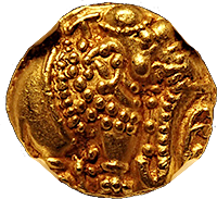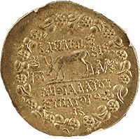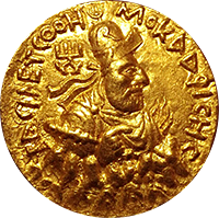 このコインは古代インドのクシャン朝時代、カドフィセス王(AD113-127年)時代に作られたダブルディナール金貨です。