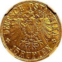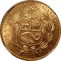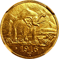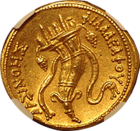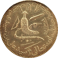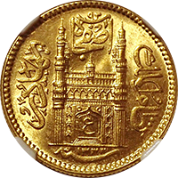 近年人気化してきたインドの金貨です、ハイデラバード藩国で1915年に発行された金貨です、インドにしては珍しく建築物が描かれています。この銘柄のMS64あたりまではよく出てきますが、MS65以上は希少品です、インド経済の成長に伴って、今後さらに人気化すると思います。