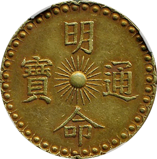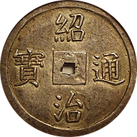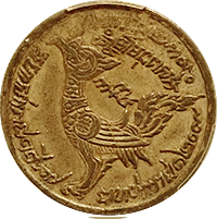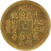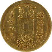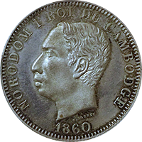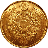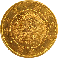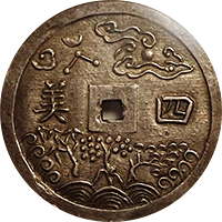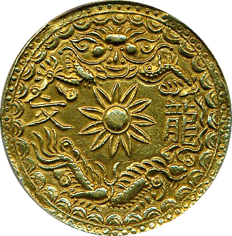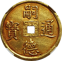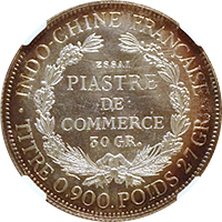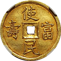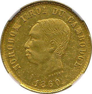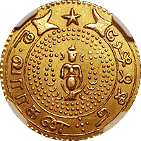 このコインはフランス統治下のベトナム(当時アンナンと呼ばれていました)で鋳造された3銭金貨です。アンナンの金貨銀貨は贈呈用に少量が作られたもので、しかも首から下げるためコインの上下に小さな穴が開いているものが大半です、かりに「穴なし」のコインがあったとしても、さらにこのコインのように鑑定会社から数字付きで評価されるコインの数はさらに絞られます、このコインは1848年~1883年にかけて王位にあったTu Duc王の時代に作られたコインで、大変貴重なコインです。