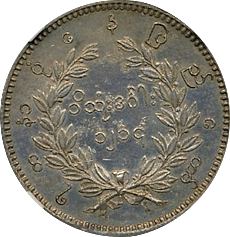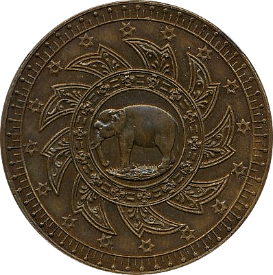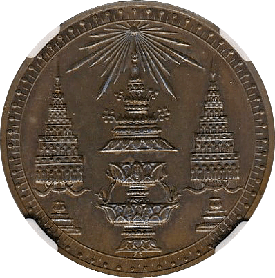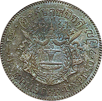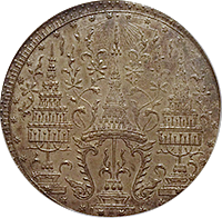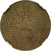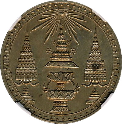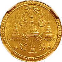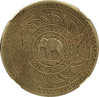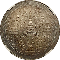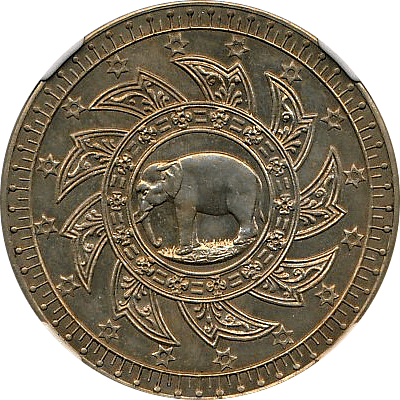 ラーマ4世の生誕60年を記念して発行された大型銀貨4バーツです、同時に2バーツ以下5種の銀貨が発行されていますが、この銘柄がフラッグシップです。市場になかなか出ない銘柄で人気もあります、たまにでてきても数字なしDetail評価が大半ですが、本貨は数字付のレアコインです。この銘柄は数字付のコインでも過去の洗浄によって白っぽく変色してしまったコインをよく見かけますが、本貨を下見したとところそれがなく、全体的に落ち着いた風合いの良いコインでした。ここのところオークションでも人気があり、昨年(2024年)の国内オークションではNGC-AU58がハンマープライス750万円で落札されました、今回は最大ビッド950万円でセリに参加しましたが、結果は750万円でした、ラッキーでした。