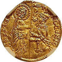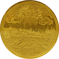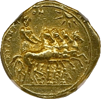 ご依頼者からの「インドのコインでいいものを提案してほしい」とご希望いただいて提案したコインです。イギリス統治下のマドラス保護領で1808年に発行された2パゴダ金貨です。重さは約6グラム、直径2センチほどの小型金貨ですが、図柄が面白く人気があります、オモテには英語とペルシャ語でパゴダと額面が打たれており、ウラには土着のタミル語・テグル語で額面が打たれています。オモテには寺院のゴープラム(塔門)が、ウラにはヒンドゥーのビシュヌ神が描かれています。なお同じデザインで1パゴダも発行されていますが、本貨は2パゴダのほうで値が張ります。状態はMS62でこの銘柄にしては並程度です。最大ビッド5,300ドルでセリに臨みましたが4,700ドルで成功しました、とてもいい結果で客様にもお喜びいただきました。