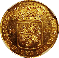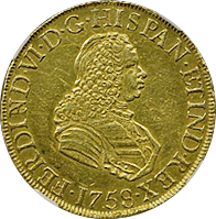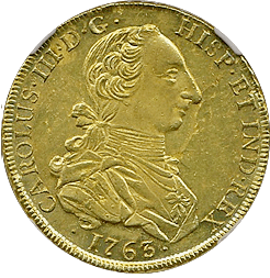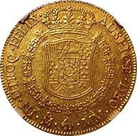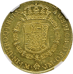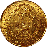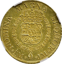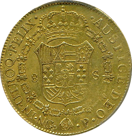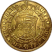 スペイン最後の肖像無し大型金貨です、一見状態が悪いようにも見えますが、よくみると未流通状態だとわかります。この時代のスペインはドイツやフランス、イタリアなどに比べるとコイン製造の技術が低く、未流通でもこんな感じです。でもかえってこの素朴さが、冒険国家スペインらしいと好む収集家がいます。昔から人気があるコインですが、ここ2年ほどで見直しが進んでいます。MS61ですら11,000ドルがオークション相場です、このオークションにこの銘柄のNGC-MS64もでていましたが、こちらのほうが状態よく提案させていただきました。残存数も少なく将来性が高いコインです。