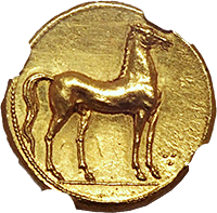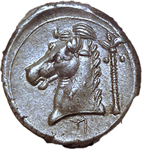 紀元前320-300年にカルタゴが支配するシチリア島で発行された銀貨テトラドラクマです、オモテはアレスーサの肖像で、その周囲には3頭のイルカが配されています、ウラは馬の頭とヤシの木です、なかなか出てこない銘柄で人気もあります。最近の落札相場も上昇傾向です、事前に設定した最大ビッドぎりぎりで取れてほっとしました。