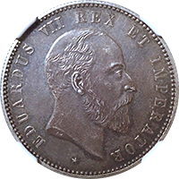 このコインはイタリアのウンベルト1世時代の1882年から1891年にかけて作られた金貨です、年毎の鋳造枚数は1880年(145枚)、1882年(1229枚)、1883年(4219枚)、1888年(1169枚)、1891年(209枚)となっていますが、実際に市場に出るのは1882年、1883年と本コインの1888年です。カタログ価格(最新のKMカタログ)では、左記3年号とも10,000ドル(MS60)となっていますが、実際には1883年銘に比べ1882年と1888年銘は一段高い価格で売買されています。