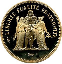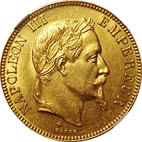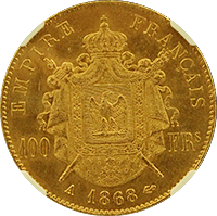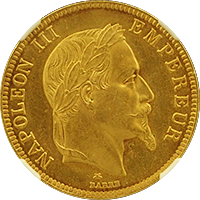 ご存知定番の100フラン金貨です。定番といっても意外と鋳造枚数は少なく、有冠(このコインのように月桂冠をかぶっている肖像)の100フランは全年号合わせても10万枚にとどきません、本コインは1869年のパリ鋳で、29000枚が発行された最多年号です。それでも本コインのようにMS評価のコインは決して多くはありません。