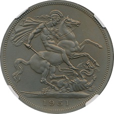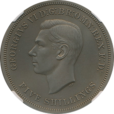 このコインは新興のネットコイン商がお好きなジョージ6世の5ポンドです、数年前までは地金コイン(ほぼ地金価格で売買されるコイン)でしたが、煽り煽られた結果、このようにPR63程度のごく標準的な個体でも、煽り系のコイン商なら、200万円近い価格で販売するようになってしまいました、さすがにここ数か月は下げ気味ですが、実はオークションではこの程度の価格で買えるのです、皆さんご注意ください。