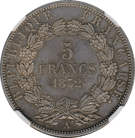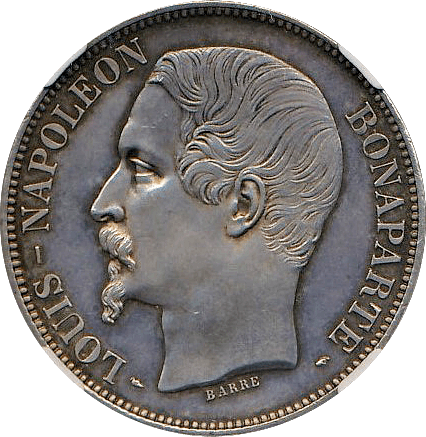 この年銘は6650枚発行の並年号ですが、MS65+は本年銘161枚中、上位2枚目(上にMS66が一枚あります)です、オモテ/ウラともフィールド部分にスレはなく、落ち着いたマット状の輝きが綺麗なコインでした。MS65クラスを最近目にしていませんが、ここ2年程のオークスヨン実績はMS64がEUR 14,000ほどMS64+がEUR 17,000ほどでした。スタートがEUR 40,000でちょっと高めでしたが、おそらく出品者がReserveを設定していたのでしょう、このようなケースでは時々スタートビッドで取れることがあり、依頼者には最大ビッドをEUR 45,000と設定したうえで提案させていただきました、結果は目論見通りEUR 45,000で成功しました。これ以上の個体は一枚しかなく、ナポレオンのコレクターなら何としても手に入れたいと考えるコインです。