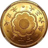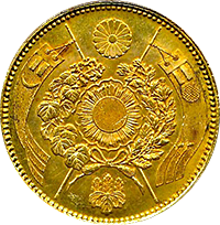 上の写真は明治新20円金貨ですが、さきほどの旧20円金貨と比べるとどうでしょう、新しいだけに状態の良いものが多く残っていますが、デザインはノッペリとしていて工夫がありません、明治も30年たつと「不平等条約を改定するため、欧米に劣らない素晴らしいコインを造ろう」という気概はこのコインから見えません、「たくさん発行しなくちゃならないので、デザインは極力簡素にしよう」という、悪い意味での大量生産品に陥ってしまったかのようです。