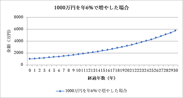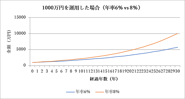 上のグラフは初期投資1000万円を30年間運用したグラフで、赤線は年率6%、青線は同8%です、ご覧のように6%では約5700万円、8%では約1億円です。