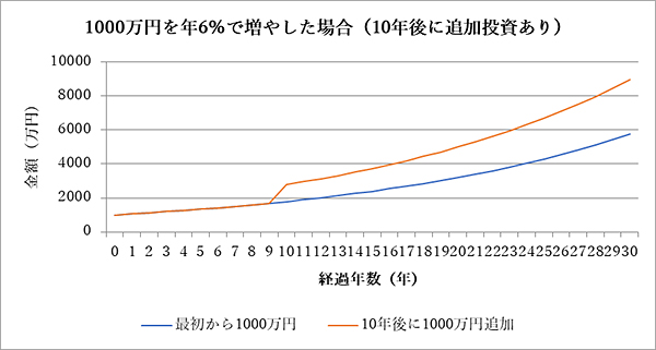 では皆さんが運用開始後10年たったとき、手元の余裕資金のうち1000万円を追加した場合、どうなるでしょう。