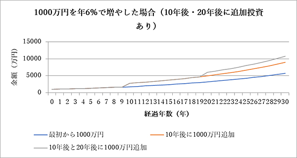 では最後に、さらに皆さんの生活に余裕ができ、運用開始の20年後に1000万円を追加して運用した場合はどうでしょう。