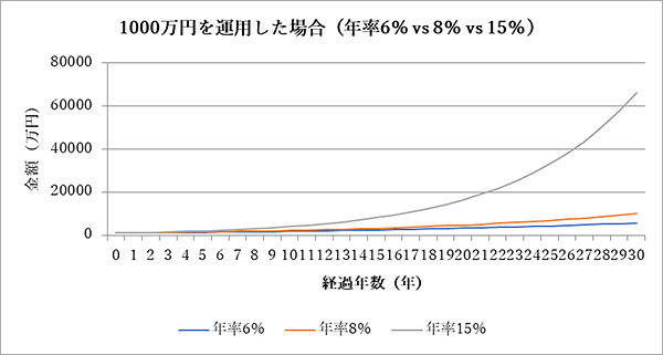 上のグラフのグレーの線が年率15%運用ですが、この場合、初期の1000万円は30年後に約6.6億円になることがわかります。これだけのおカネを確保できれば、将来の選択肢はかなり増えますし、適切に使うことによって豊かな後半人生を送ることもできます。