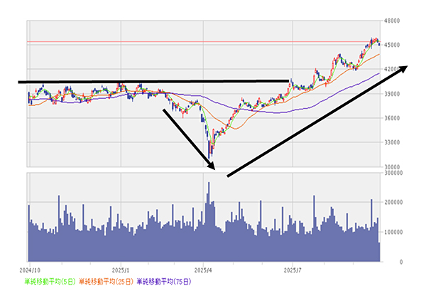 ご覧のように4月に日経平均は一時31,000円台を付けましたが、足元では45,000円台です。よく考えるとこの上昇はすごいです、率にして45%の上げをわずか半年で達成してしまったことになります、株価水準が高いだけに上げ幅もすごく14,000円以上の上昇です。
