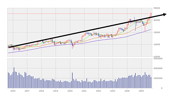 ご覧のようにこの10年間をみると、細かい上下動を繰り返しながらも趨勢としては右肩上がりです。そういえば10年ほど前、日経平均は17,000円あたりでした、もしあのころ「10年後に45,000円になる」なんて言ったら、間違いなく「なにをアホなことう言うとるんや」と言われたはずです。
