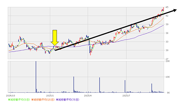 年初時点ですでに30ドルと高値だったのですが、そこから現在の44ドルまで50%ほどの上昇です。