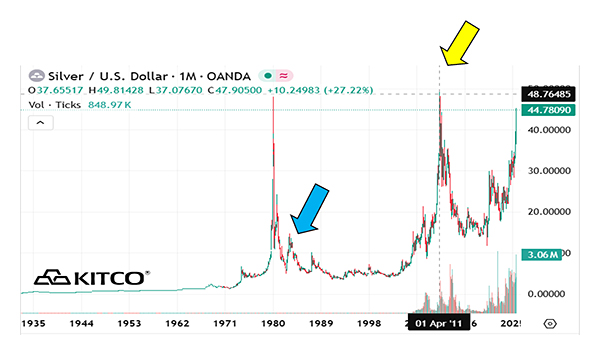 ご覧のように銀の価格は過去2回暴騰しています、まさに暴騰という言葉がふさわしい急上昇でした、一回目は1980年(青矢印)、そして2回目は2011年(黄色矢印)ですが、2回とも高値は一瞬で、その後に急落しています。