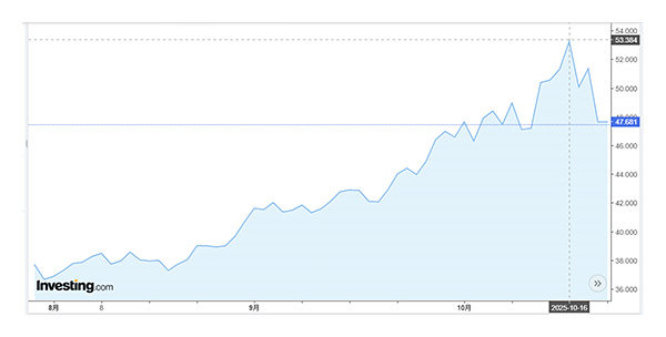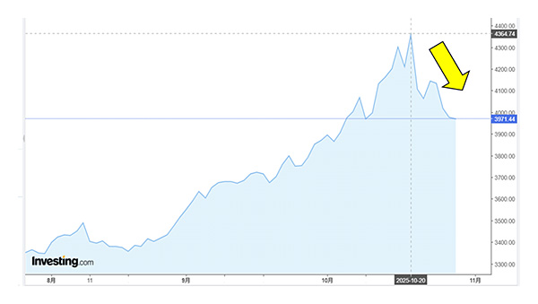 このグラフは3か月チャートですが、ご覧のように10月の半ばから急に下がり、ピーク(4364.7ドル)から現在(3971.4ドル)まで9%ほどの急落です。市場では「米中間の緊張緩和の兆し」を反映したものだという意見が多いようですが、理由はさておき、私たちは改めて金(Gold)の価格変動の激しさを知りました。