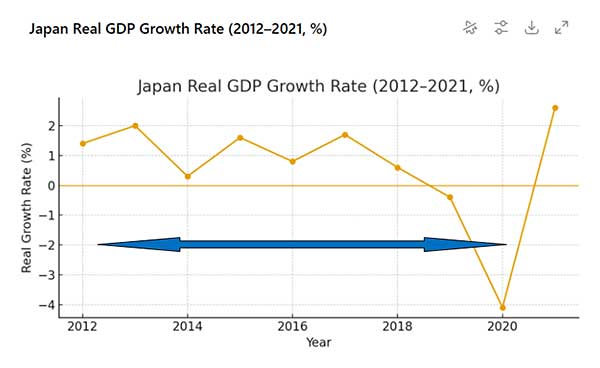 (日本の実質GDP成長率2012-2021年推移:チャットGPTにより筆者作成)