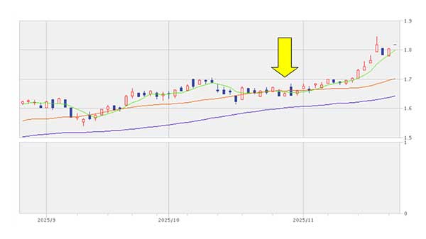 この金利上昇は高市さん以降さらに顕著です、以下は直近の3か月の長期金利の推移ですが、ご覧のように足元1.8%超えは17年ぶりの高水準です。