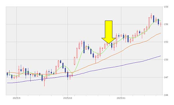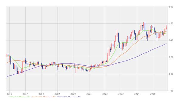 上のグラフはドル円レートの10年推移ですが、足元で再び1ドル=160円が見えてきました、高市政権以前から円安傾向は見えていましたが、下の3か月グラフをみると新政権移行、さらに円安が加速しているように見えます。
