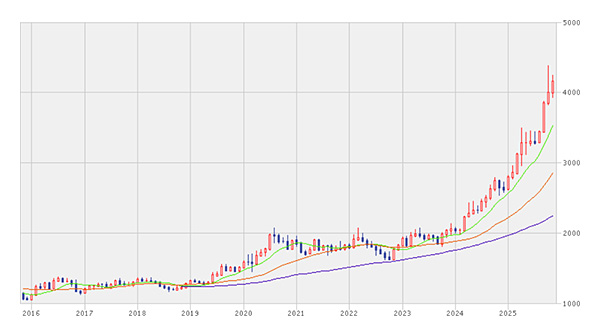 下の3つのグラフはすべて直近10年間のドル建て価格で、上から順に