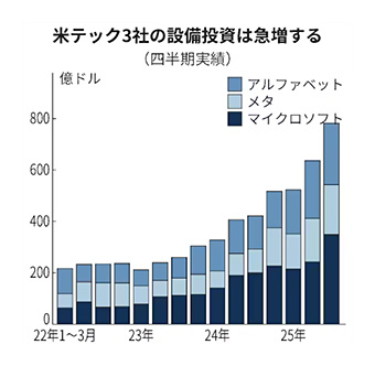 まずグーグル、マイクロソフト、メタなど、いわゆるハイパースケーラーと呼ばれる巨大企業によるAIサーバー投資の規模の大きさです。下のグラフは日経新聞10/30記事からの転載ですが、上記3社の設備投資額は急増中です。