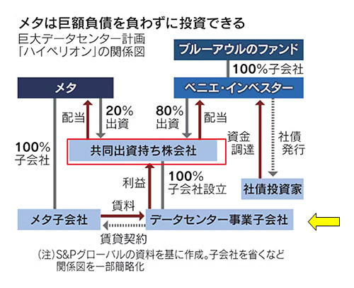 下の関係図はメタの事例ですが、メタはファンドと共同で設立したSPV(赤枠)経由でAIデータセンターを設立する構図です。なにやら複雑なスキームではありますが、このような仕組みを作ることによって、メタは自ら直接債務を負うことなく、市場からAI資金を調達することができます。