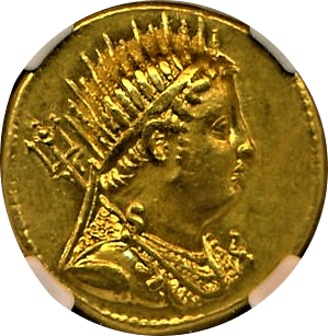 古代最大の金貨、デカドラクマです。デカは10ですから10ドラクマ金貨です、肖像はプトレマイオス3世、紀元前3世紀のコインです。