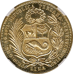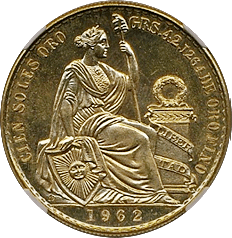 1950-1970年にかけペルーで発行された大型金貨100ソルです、この銘柄に関してここで説明するまでもないと思いますが、最近の出世コインです、1962年銘は9,678枚発行の並年号ですが、状態は飛び切り良くNGC-MS67です、当時の僕は以下のコメントを書いてます。